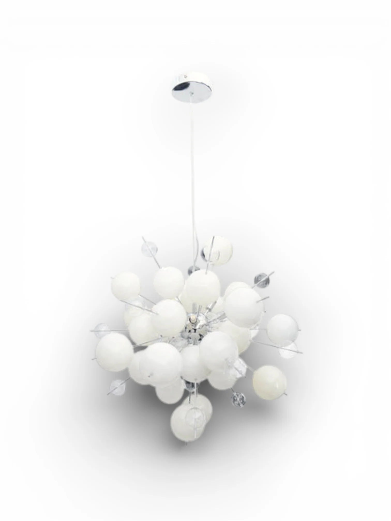 De hanglamp "explosie" lijkt in de kamer te zweven, de witte en kleurloze glazen ballen zien er zo delicaat en licht uit. De staven met de ballen zijn bevestigd aan een chroom -gekleurde, glanzende mediumbal.