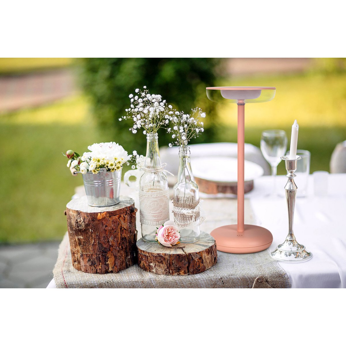 Noteloze tabletlicht "PASI" voor buiten en binnen, gemaakt van metaal en plastic in roze, dimbaar, met aanraking en geheugenfunctie, ca. 26 cm hoog